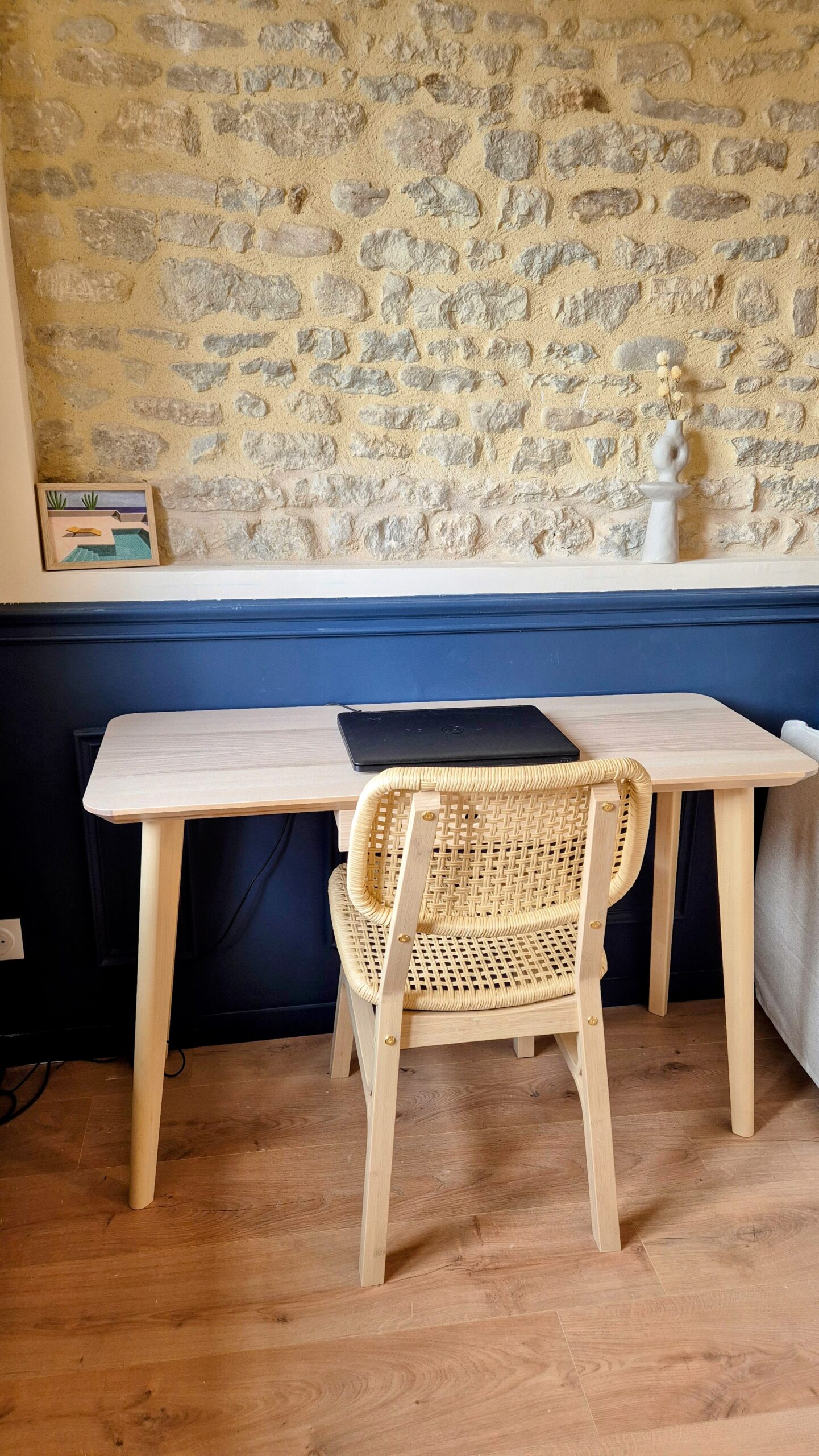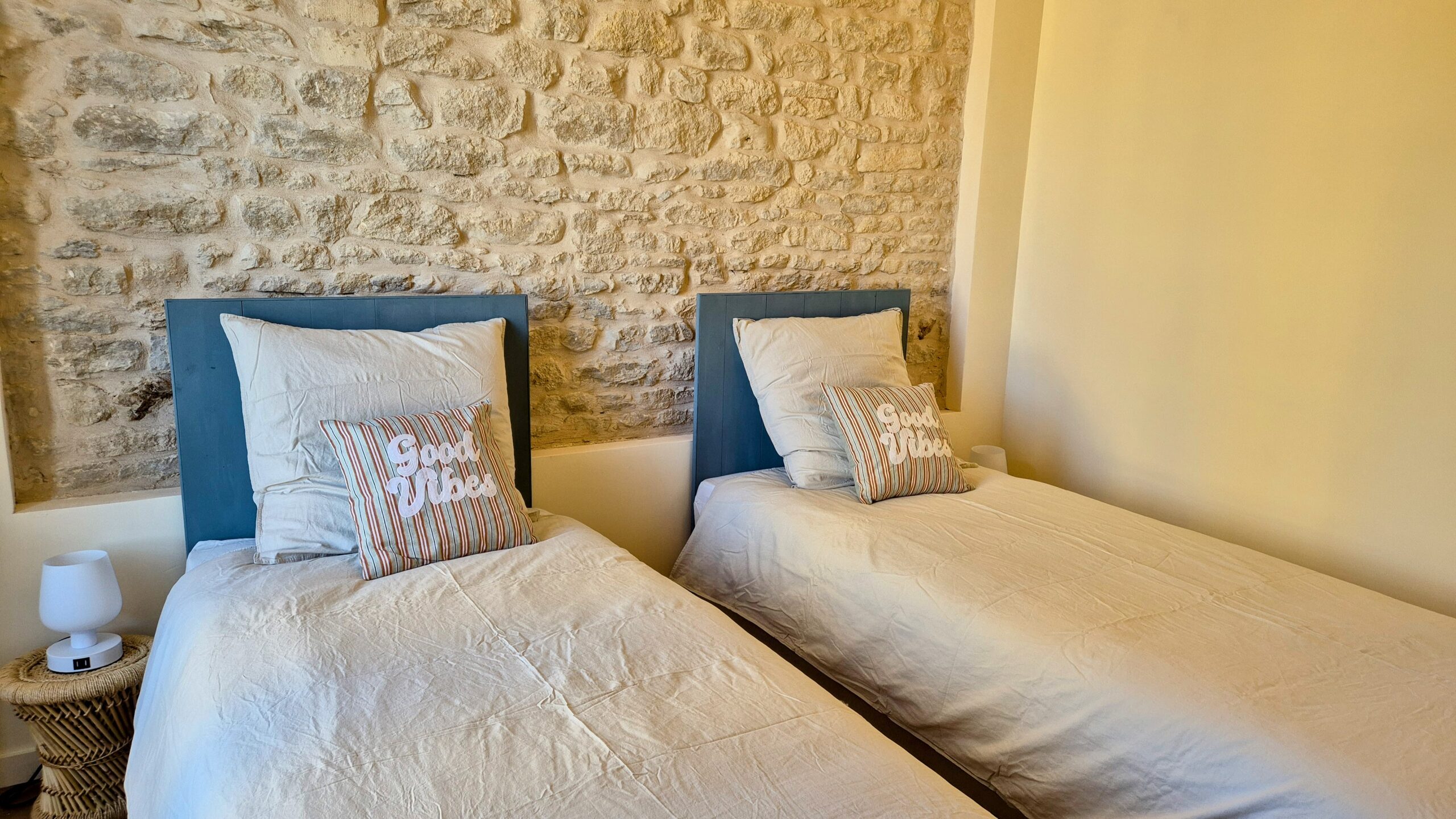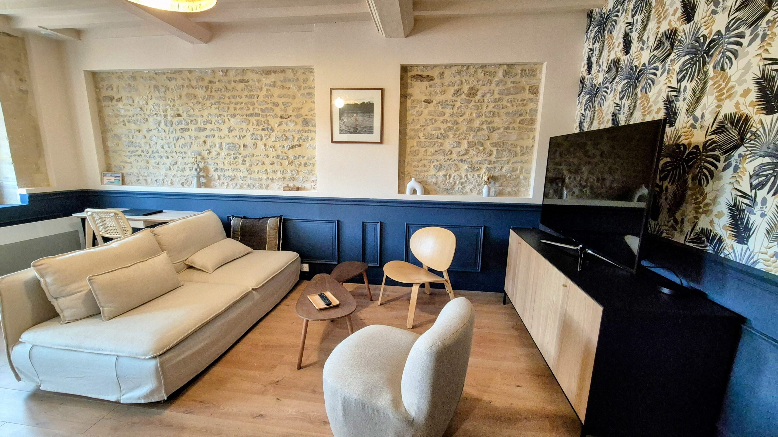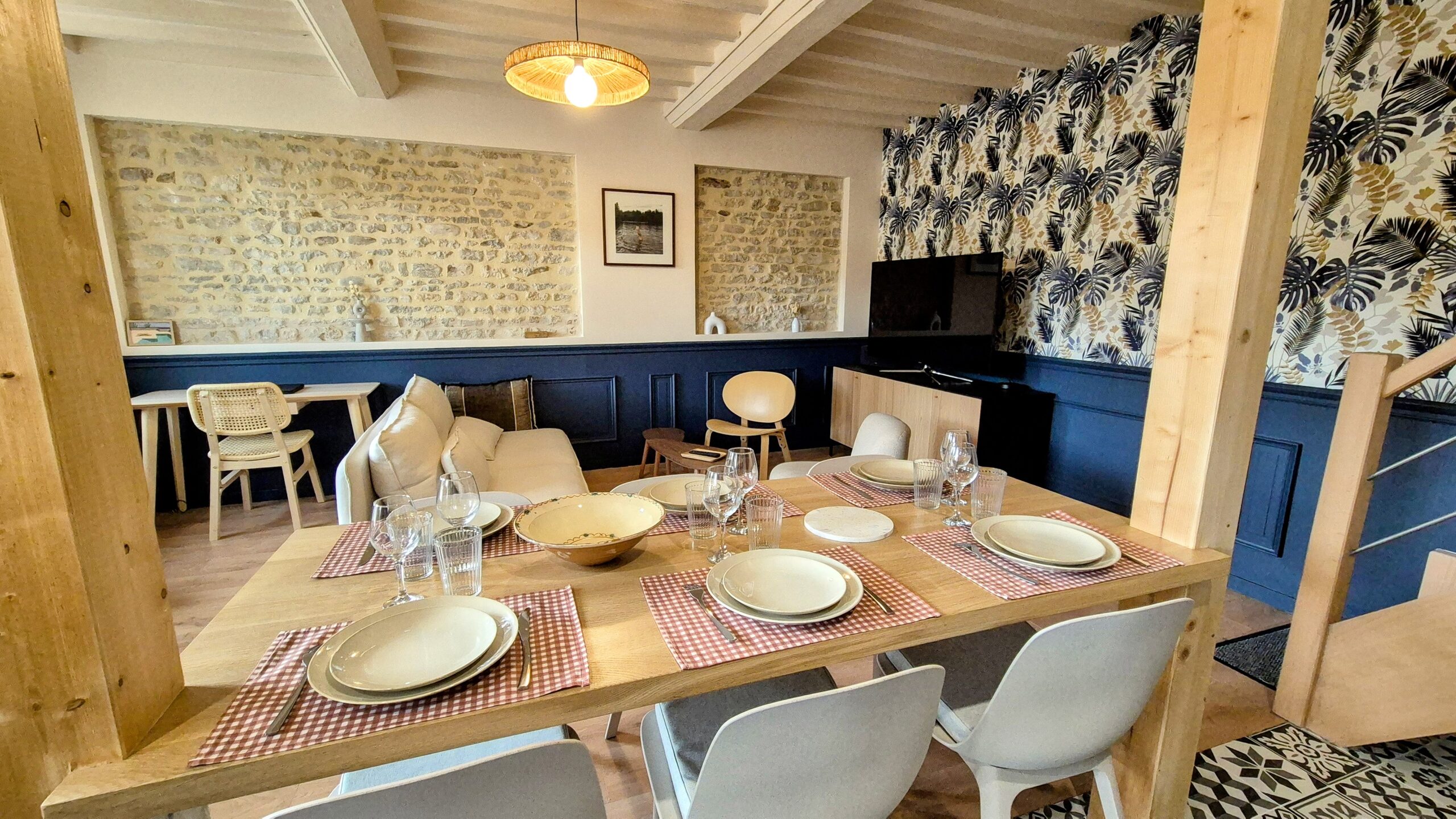 La maison dispose de trois chambres, une salle de bains, une terrasse ainsi qu’un grand espace de vie confortable et tout équipé (cuisine, salle à manger, salon, bureau).